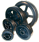 Rubber molded on cast-iron wheel. Sizes range from 4” to 12” diameters. Our tread features “sure-grip” bonding to insure long life and non-separation. These wheels are highly shock-absorbing, offering maximum load protection and quiet movement. A special low-profile rubber tread is also available for a slightly increased load capacity. A zerk fitting is installed into the wheel hub on all wheels above 4” diameter. Common applications include: Stock Carts, Platform Trucks, Hand Trucks and Refuse Disposal Bins.
