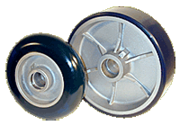 Polyurethane tread molded to an aluminum center. Our tread features “sure-grip” bonding to insure long life and non-separation. These wheels are shock-absorbing, offering maximum load protection and quiet movement. A zerk fitting is installed in the wheel hub. Recommended for heavy loads and rough floor conditions. Common applications include: Hand Trucks, Platform Trucks and Stock Carts.