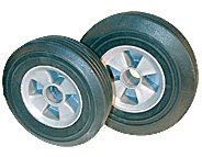 Recycled rubber on radial disc plastic center wheels. Available with a rib style tread and in on-center or off-set configurations. Commonly used where noise sensitivity and shock absorption is a must. Applications include: Handtrucks, Platform Trucks and Stock Carts.